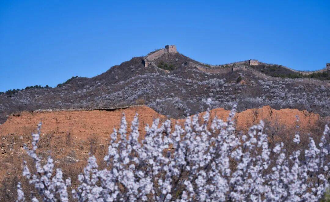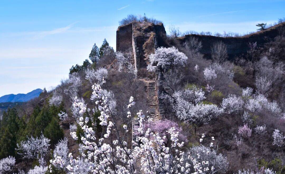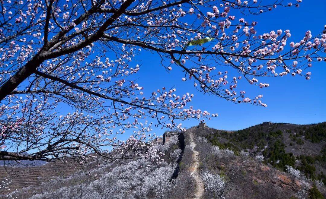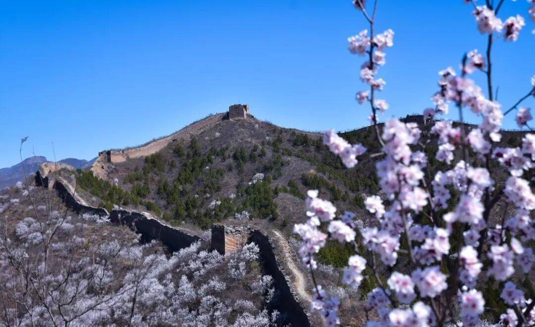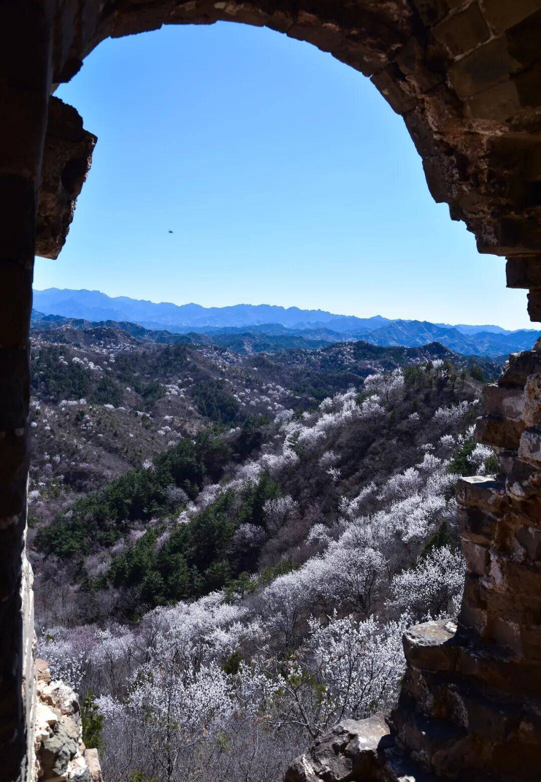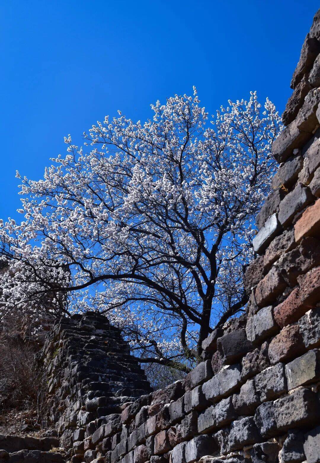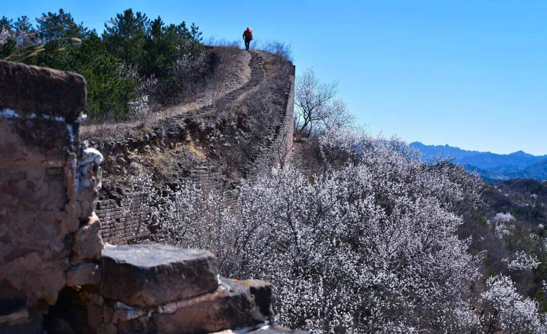 一路上都是蓝天白云,春光明媚,经常有花枝伸到城墙之内,成为很好的取景参照。整体上,这一段长城蜿蜒曲折,一路起起伏伏但爬升不大,这段颇具历史沧桑感的长城,透过长城的窗口看春天更是美妙,这是自然景观、人文景观、历史文物的春天的完美融合。