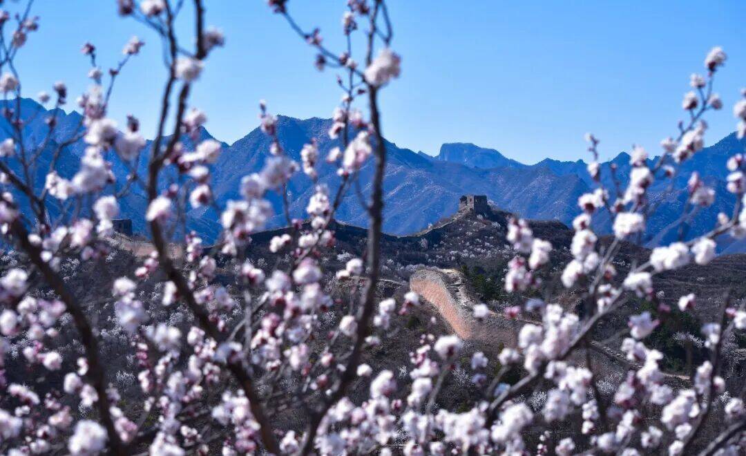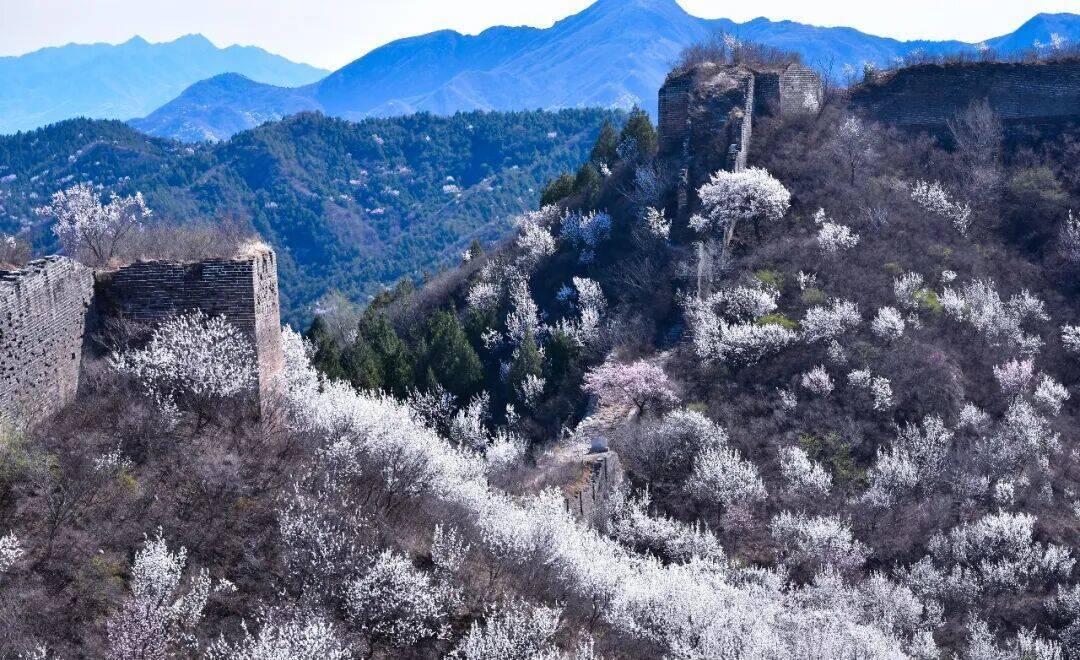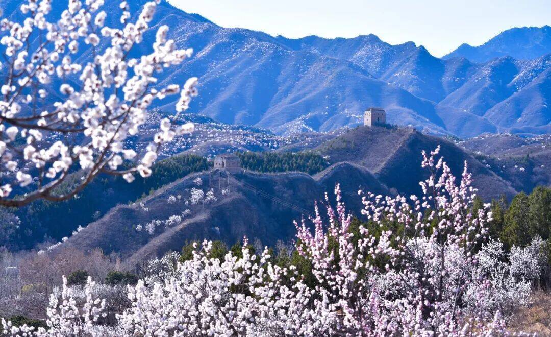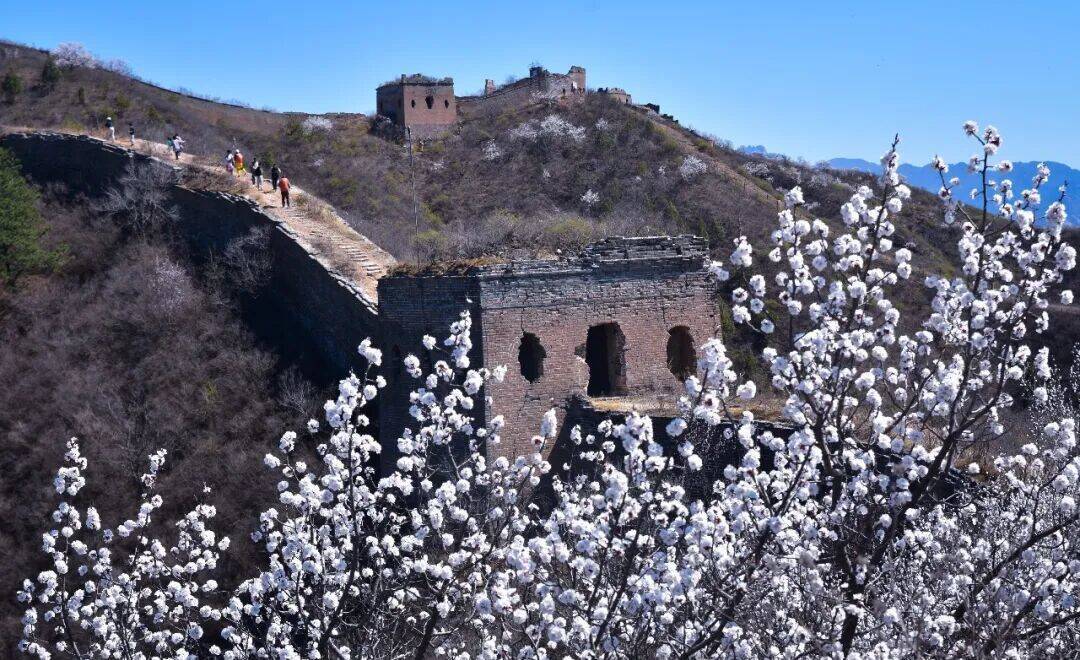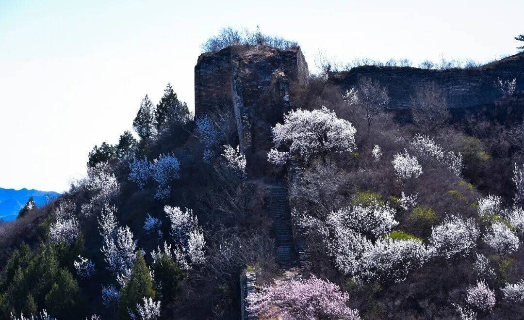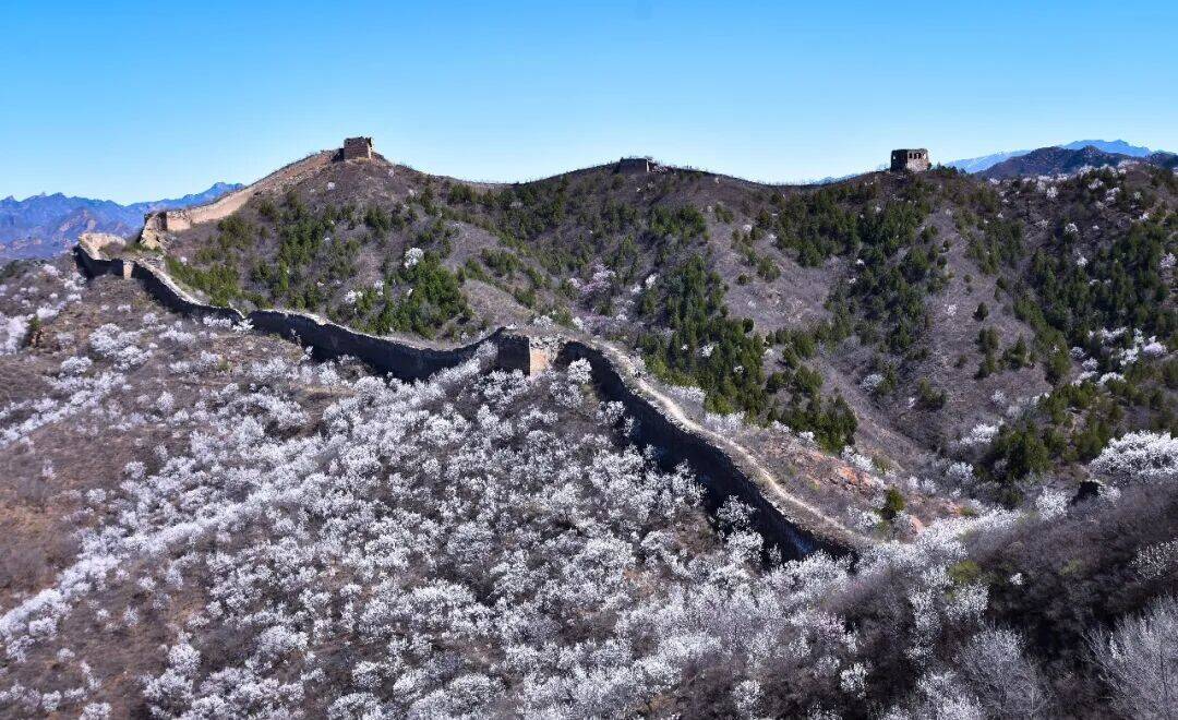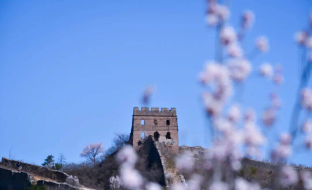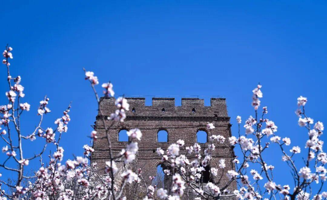 一路上都是蓝天白云,春光明媚,经常有花枝伸到城墙之内,成为很好的取景参照。整体上,这一段长城蜿蜒曲折,一路起起伏伏但爬升不大,这段颇具历史沧桑感的长城,透过长城的窗口看春天更是美妙,这是自然景观、人文景观、历史文物的春天的完美融合。