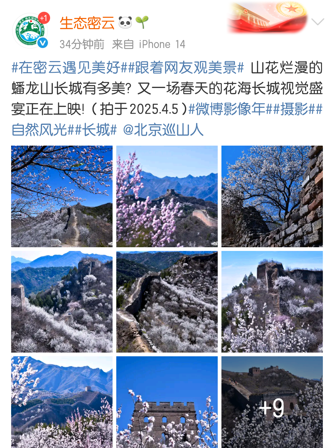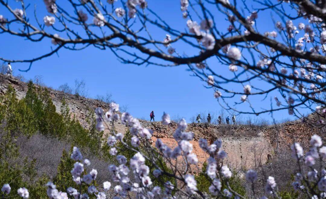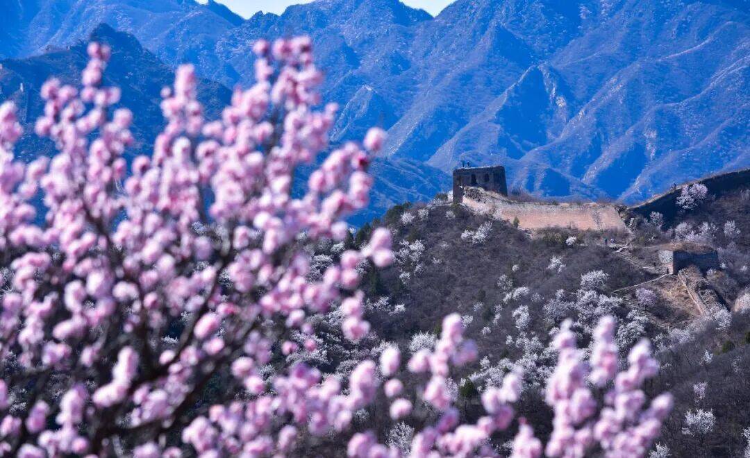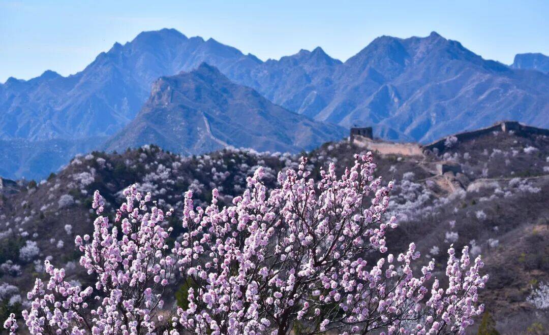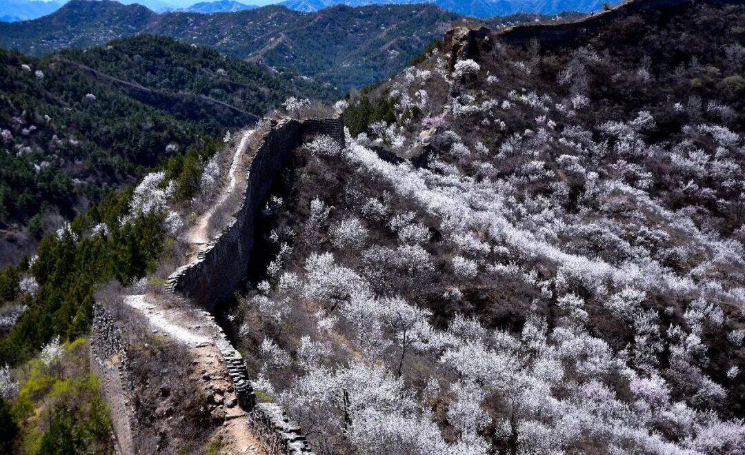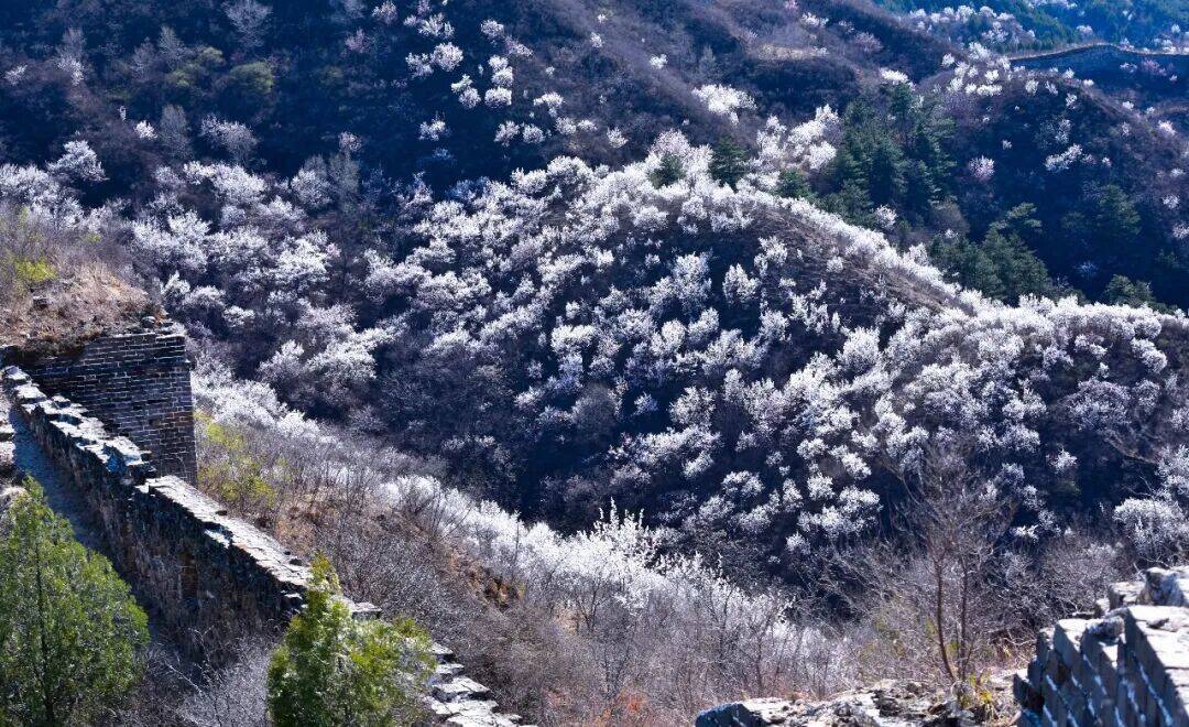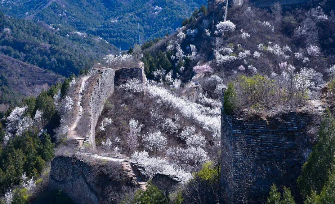 一路上都是蓝天白云,春光明媚,经常有花枝伸到城墙之内,成为很好的取景参照。整体上,这一段长城蜿蜒曲折,一路起起伏伏但爬升不大,这段颇具历史沧桑感的长城,透过长城的窗口看春天更是美妙,这是自然景观、人文景观、历史文物的春天的完美融合。
