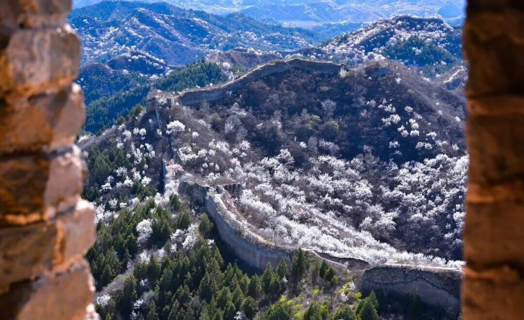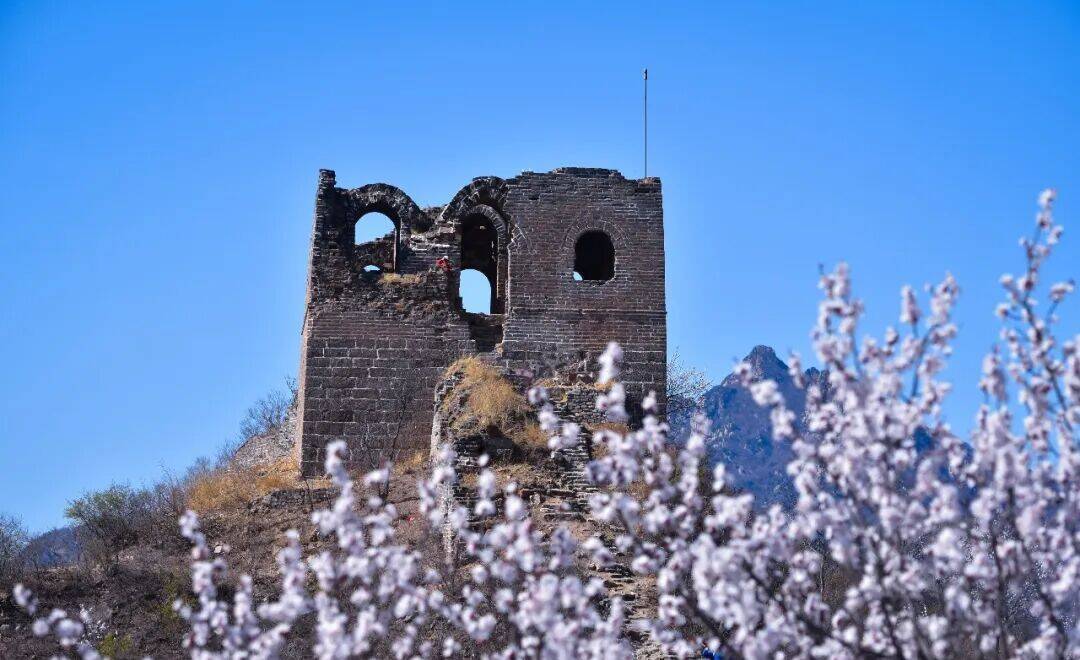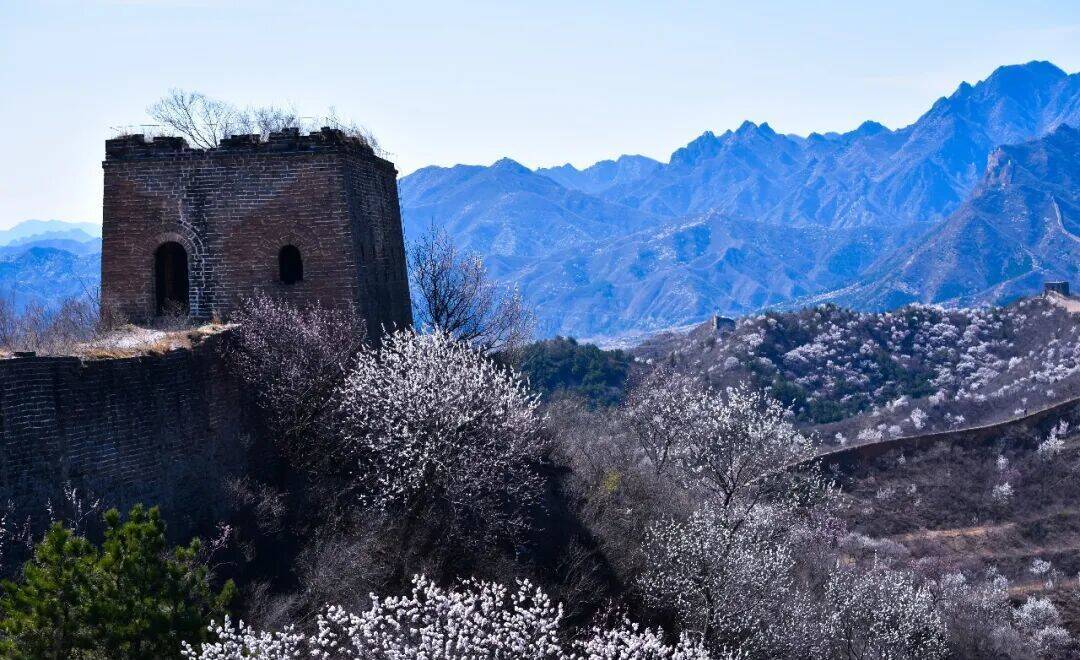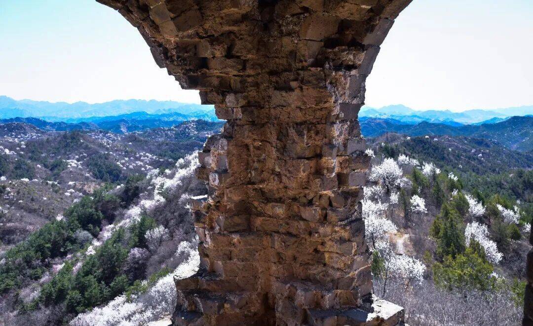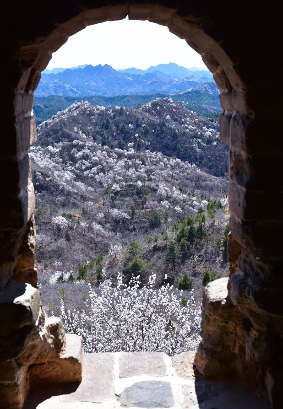 二十四眼楼是蟠龙山长城的最高点,这座敌楼高大雄伟,两层构造,每面六眼,当年的古北口战役这里是主战场,所以损毁严重,至今这座敌楼里还有一座圆型碉堡,这座敌楼旁有一棵杏树正在盛开。想拍好花季的二十四眼楼并不太容易,要距离比较远,借助城墙上的花枝近景效果更好一些。